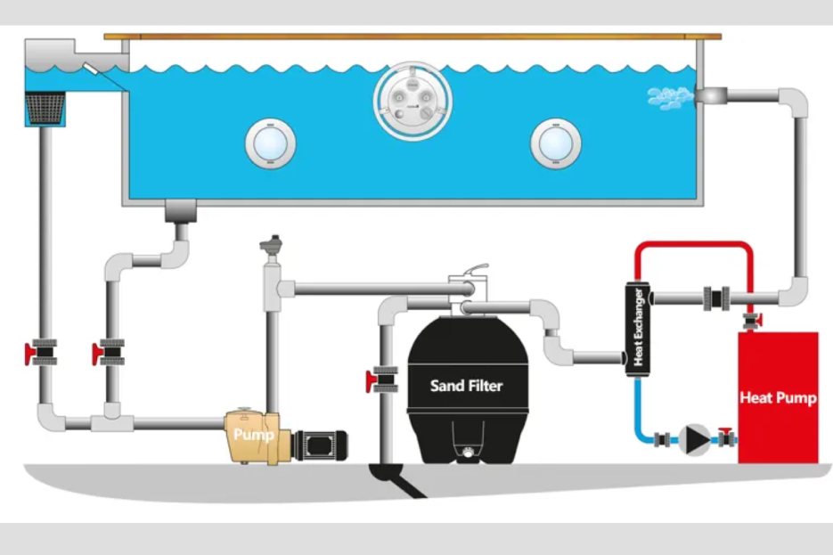 پمپ سیرکولاسیون استخر – برای گردش مداوم آب بین استخر و مبدل حرارتی.