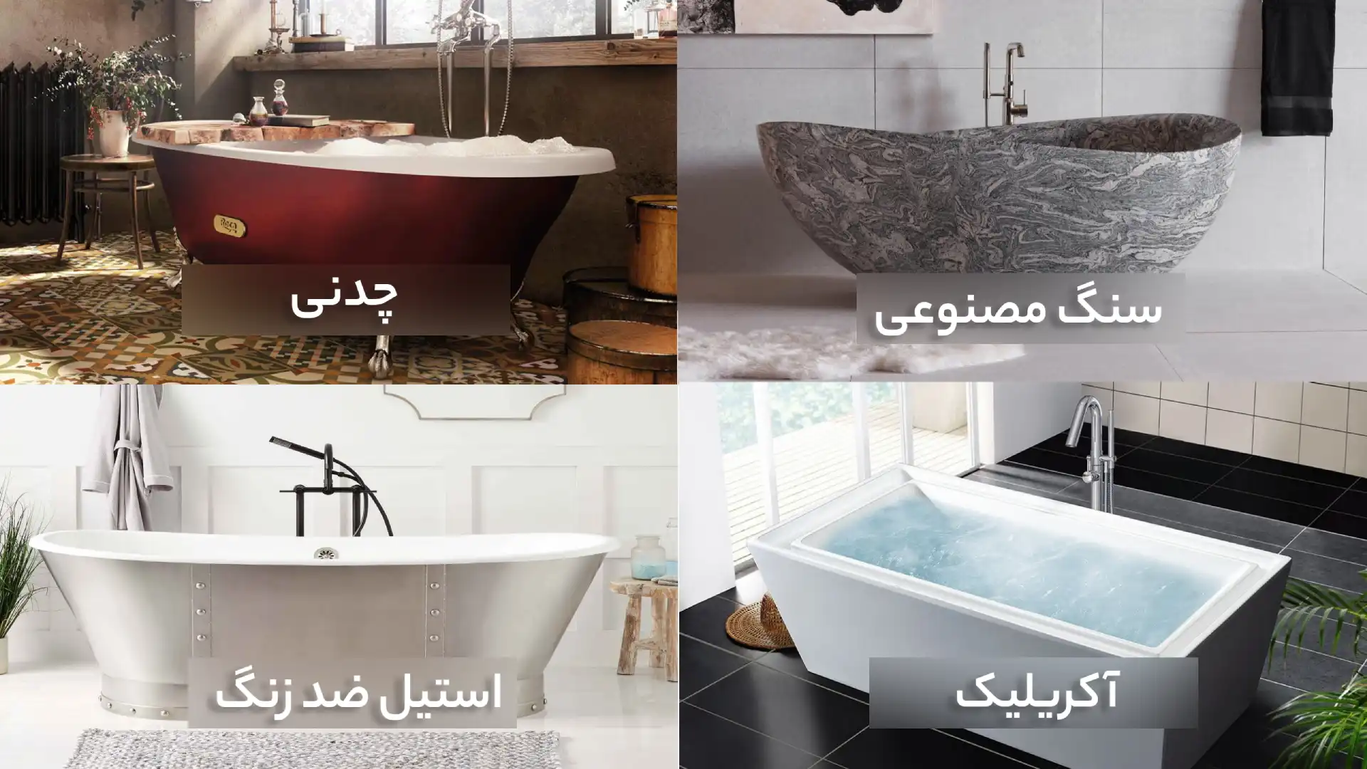 آکریلیک مقاوم در برابر حرارت و رطوبت، سبک و نصب آسان است. سطح صاف آن باعث میشود دمای آب برای مدت طولانی حفظ شود و شستشو و نگهداری آسان باشد. همچنین این جنس در برابر ضربه و خراش مقاومت مناسبی دارد و بهراحتی میتوان آن را با انواع روشهای استاندارد تمیز کرد.