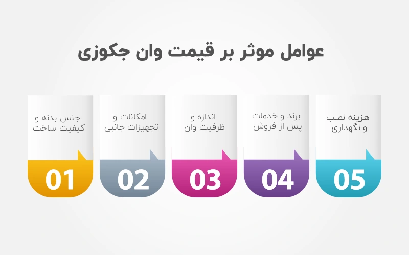 قیمت وان جکوزی وابسته به مواردی مانند ابعاد، جنس، نوع شاسی، شیرآلات، نوع تیپ جکوزی ها (آپشن های مختلف که براساس تیپ جکوزی متغییر است)، همچنین برای سونا امکانات ماساژور، سیستم صوتی و روشنایی و... متفاوت می باشد.