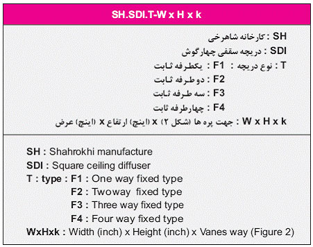 کد سفارش: دریچه‌های سقفی چهار گوش ثابت دمپردار و بدون دمپر شاهرخی با کد سفارش زیر مشخص می شوند.